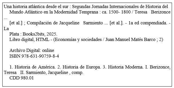 Sarmiento, J., Roca, F., Sixto Barcia, A., y Castro Redondo, R. (Coords.) (2025). Una historia atlántica desde el sur. Segundas Jornadas Internacionales de Historia del Mundo Atlántico en la Modernidad Temprana (ca. 1500- 1800). Books2bits. https://doi.org/10.51438/B2Bsarosica2025