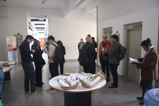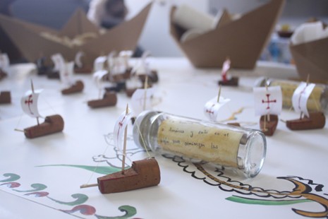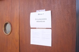 Con el objetivo de jerarquizar los espacios de encuentro en las jornadas, durante las reuniones previas de preparación surgió la idea de realizar, en el marco de los intervalos entre las ponencias, un café que ofreciera una experiencia atlántica además del momento de confort y descanso. Se realizó un montaje expositivo y , por supuesto, participativo (nada ofrece una experiencia tan integral como la comida, al final de cuentas). Este Café- Exposición se llamó “Sabores del Atlántico” y fue realizado con la colaboración de Camilo Rollié (Prof. gastronómico). Utilizamos el hall de entrada del Centro Karakachoff perteneciente a la Universidad Nacional de La Plata y donde sesionaron las jornadas de trabajo, para presentar una mesa armada como un gran mapa atlántico y pequeños barquitos hechos de corcho, palillos y papel que navegaban sobre él. Allí se sirvió café, té, galletas marineras caseras puestas en bandejas con forma de grandes barcos de papel y dulce de tomate casero. Todo ello en una simple pero cuidada selección que invitaba a pensar las conexiones atlánticas durante el intervalo. Cada uno de estos elementos se acompañó de una cartelería sencilla y temática aclaratoria acerca de estos productos comestibles y su travesía.