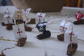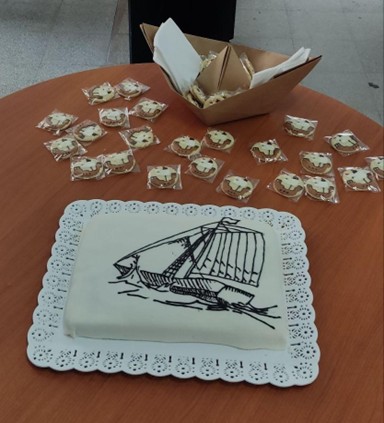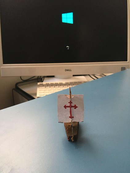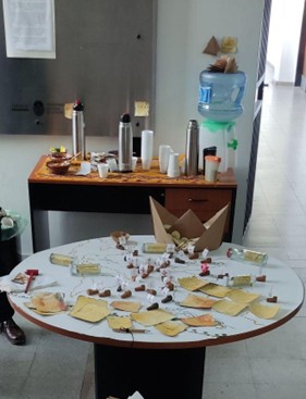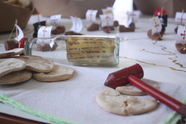 Sabemos que los encuentros académicos tienen una función social y somos conscientes de que nuestra tarea contribuye a generar el espacio de intercambio, de conexión con otres. Esto, no solamente en torno a una mesa de exposición sino también en torno a una mesa cuyo mantel es un mapa de cartulina donde navegan barcos realizados artesanalmente con corcho —que luego oficiaron de souvenir—, donde les investigadores podrán comer una galleta marinera elaborada según la receta tradicional —y que se puede romper con un martillo—, donde la virtualidad se interrumpe con el olor y el sabor de los productos que circulaban por el Atlántico, tales como tabaco, azúcar y dulces; donde la interacción se da entre trozos de papel para escribir o dibujar aquello que les estuviera resonando. Aunque esta ambientación no fue ideada por nosotres, fue también una labor nuestra sostener esa propuesta de fantasía atlántica que rodeaba el encuentro.